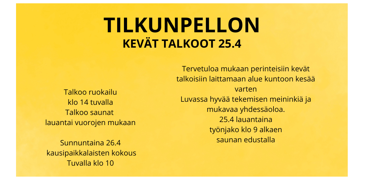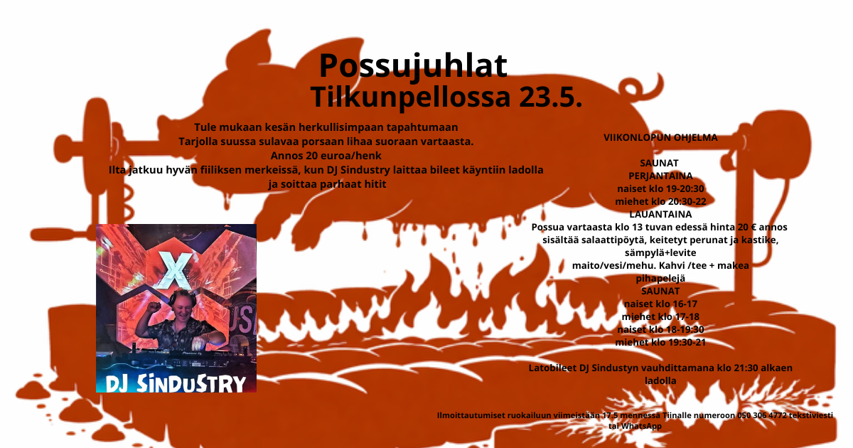 Tule mukaan kesän herkullisimpaan tapahtumaan! Tilkunpellon possujuhlille! Ilmoittautumiset ruokailuun viimeistään 17.5 Tiina Mahkoselle numeroon 050 306 4772 joko tekstiviesti tai WhatsApp. Possu…